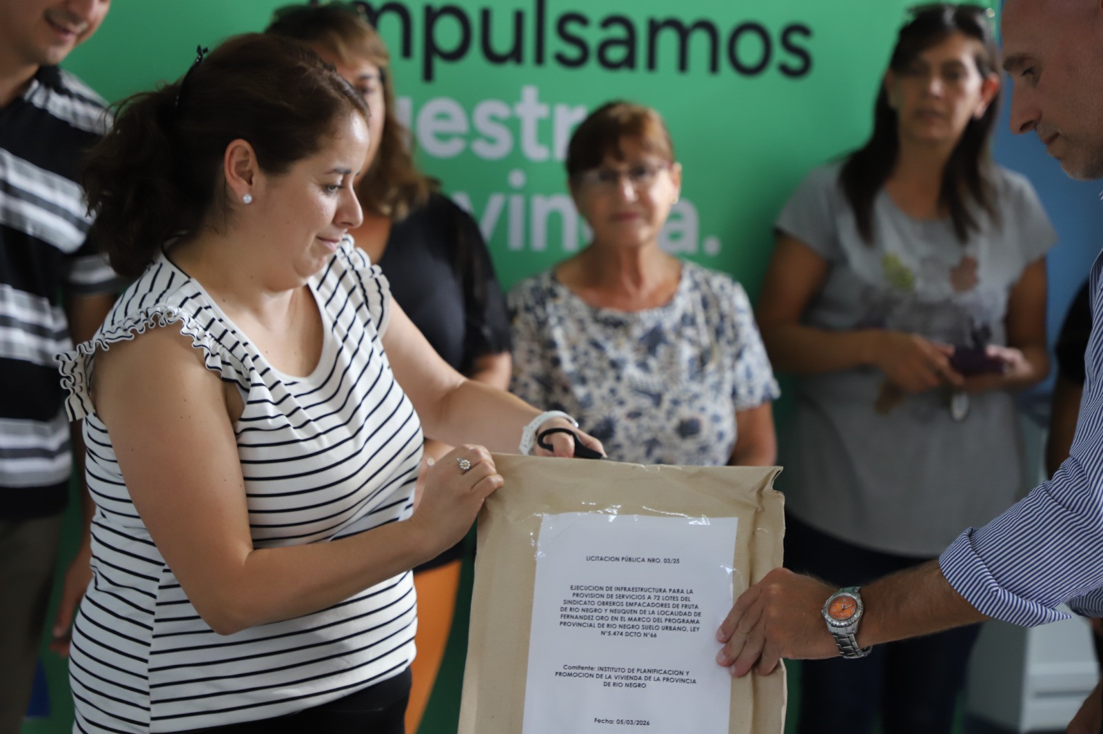 Uno de los ejes centrales de la jornada fue garantizar el acceso a la tierra con servicios. Para ello, se llevó a cabo la apertura de sobres de la licitación pública enmarcada en el programa Suelo Urbano, destinada a ejecutar las obras de infraestructura de agua potable y red eléctrica para 72 lotes pertenecientes al Sindicato de la Fruta. En tiempos de alta demanda habitacional en el Alto Valle, el Estado rionegrino responde dotando de saneamiento y previsibilidad a las familias trabajadoras.