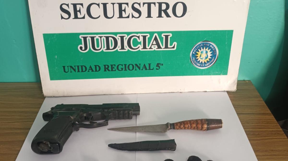 Dos jóvenes de Allen fueron demorados por personal de la Comisaría 26 en Fernández Oro tras ser detectados con una réplica de una pistola calibre 45 y un cuchillo. El procedimiento se activó luego de que un vecino alertara sobre movimientos sospechosos en la zona comercial.